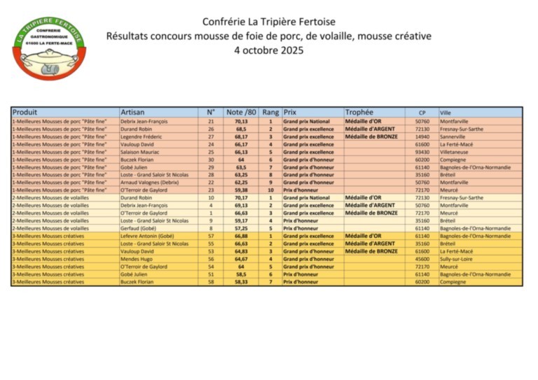 04 Octobre 2025 : Résultats Concours national et international de mousse (à base de foies de porc ou de volailles) et mousses créatives